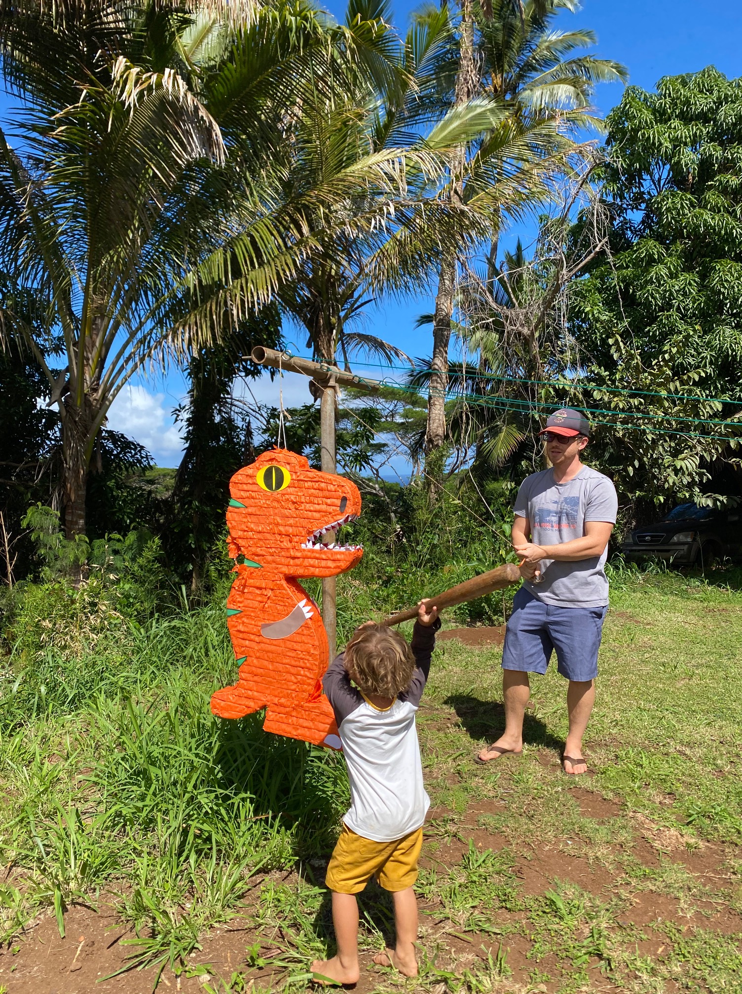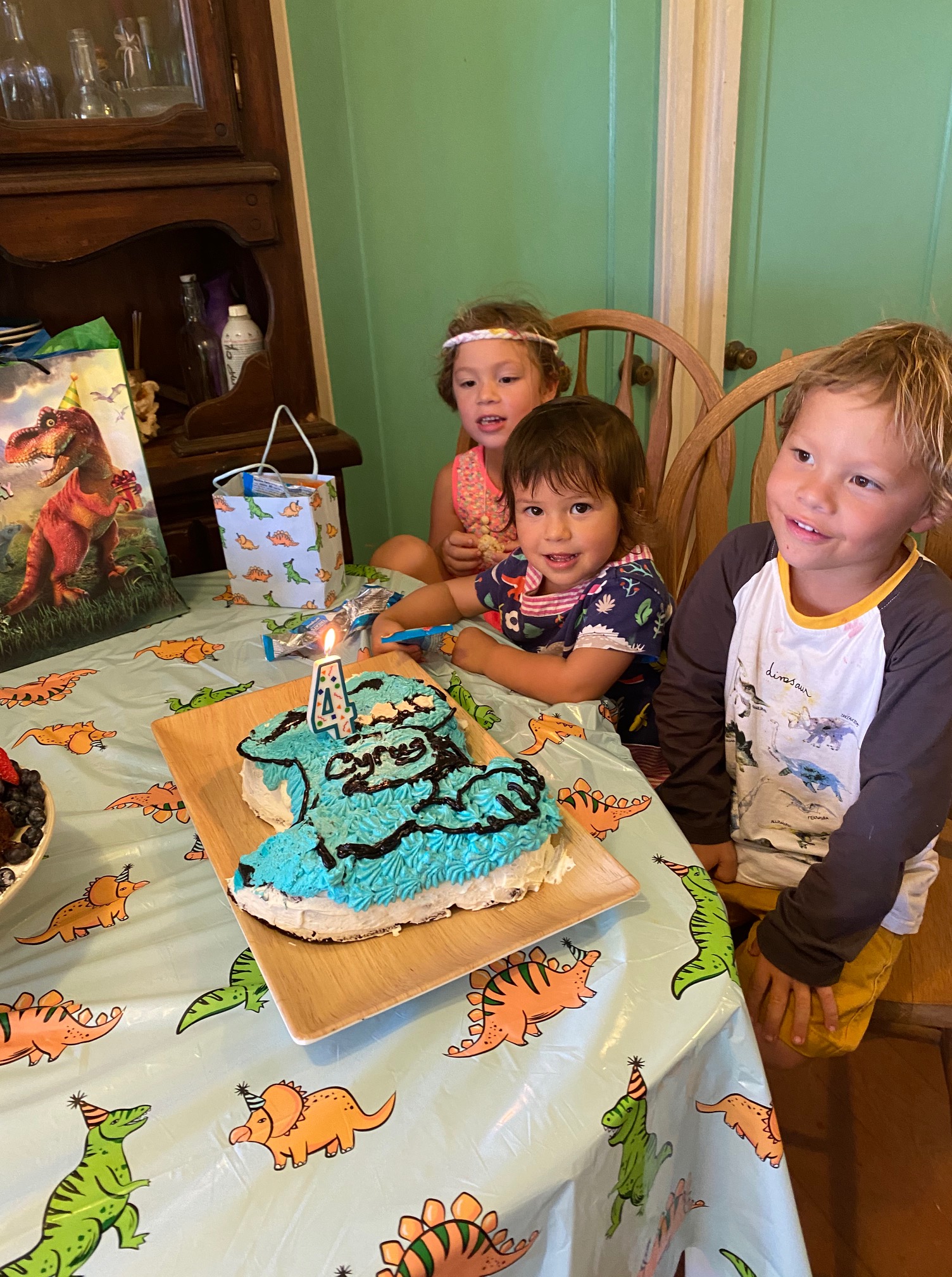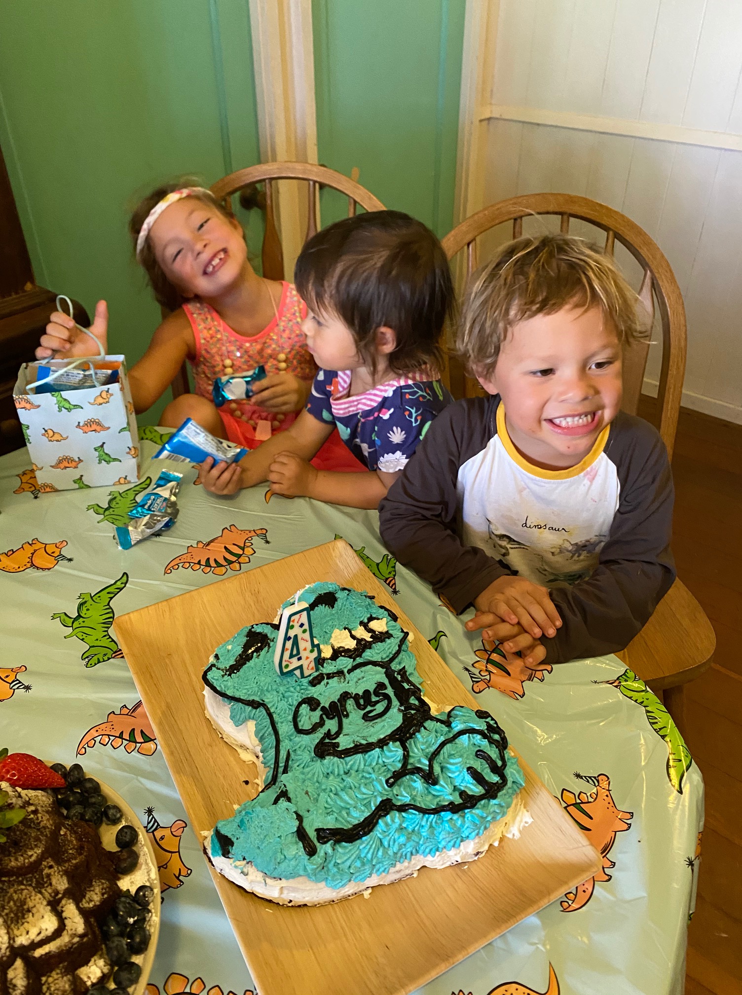 We celebrated Cyrus at my family’s farm with a rich, moist homemade chocolate cake that was allergy-friendly and shaped like a giant, smiling T-rex. Our whole menu centered around foods that Cyrus could enjoy. An allergy-friendly Hawaiian feast! I made two types of fried chicken, Hawaiian-style mochiko chicken (battered in rice flour) and buttermilk ranch chicken, two cakes – one chocolate on chocolate and the other apple-banana with chocolate, fresh broccoli-cranberry salad and kale salad, potato salad, and cut up chunks of fresh sunrise papaya and Maui gold pineapple. Really, if you wake up at 4 a.m. and start prepping and cooking for a lunchtime party, the sky’s the limit with what you can make! 😉