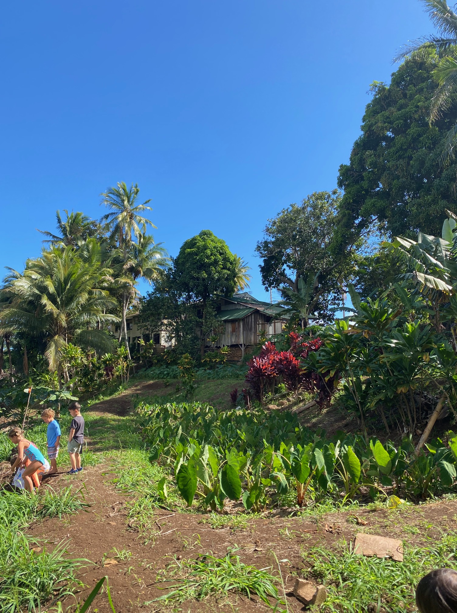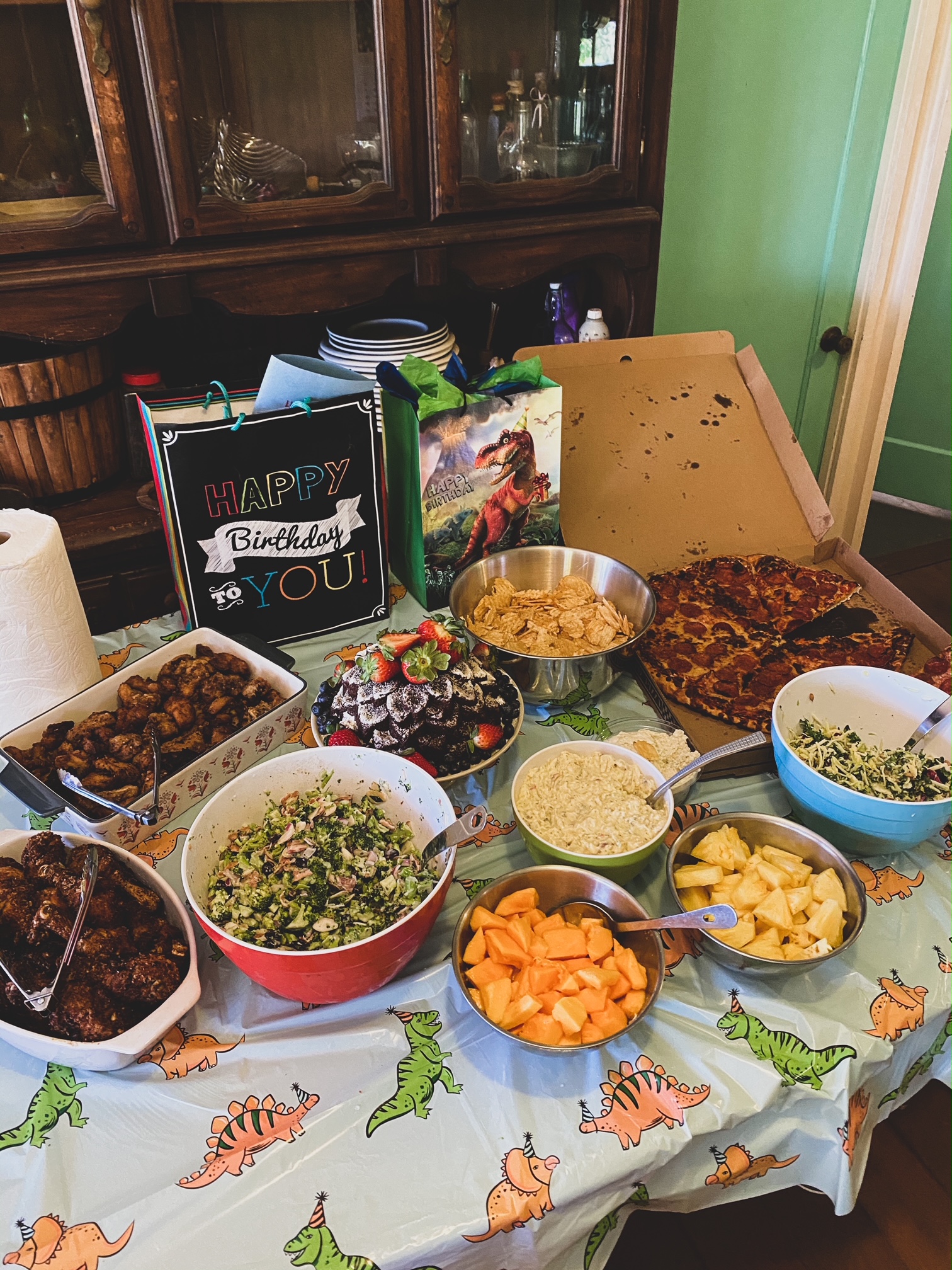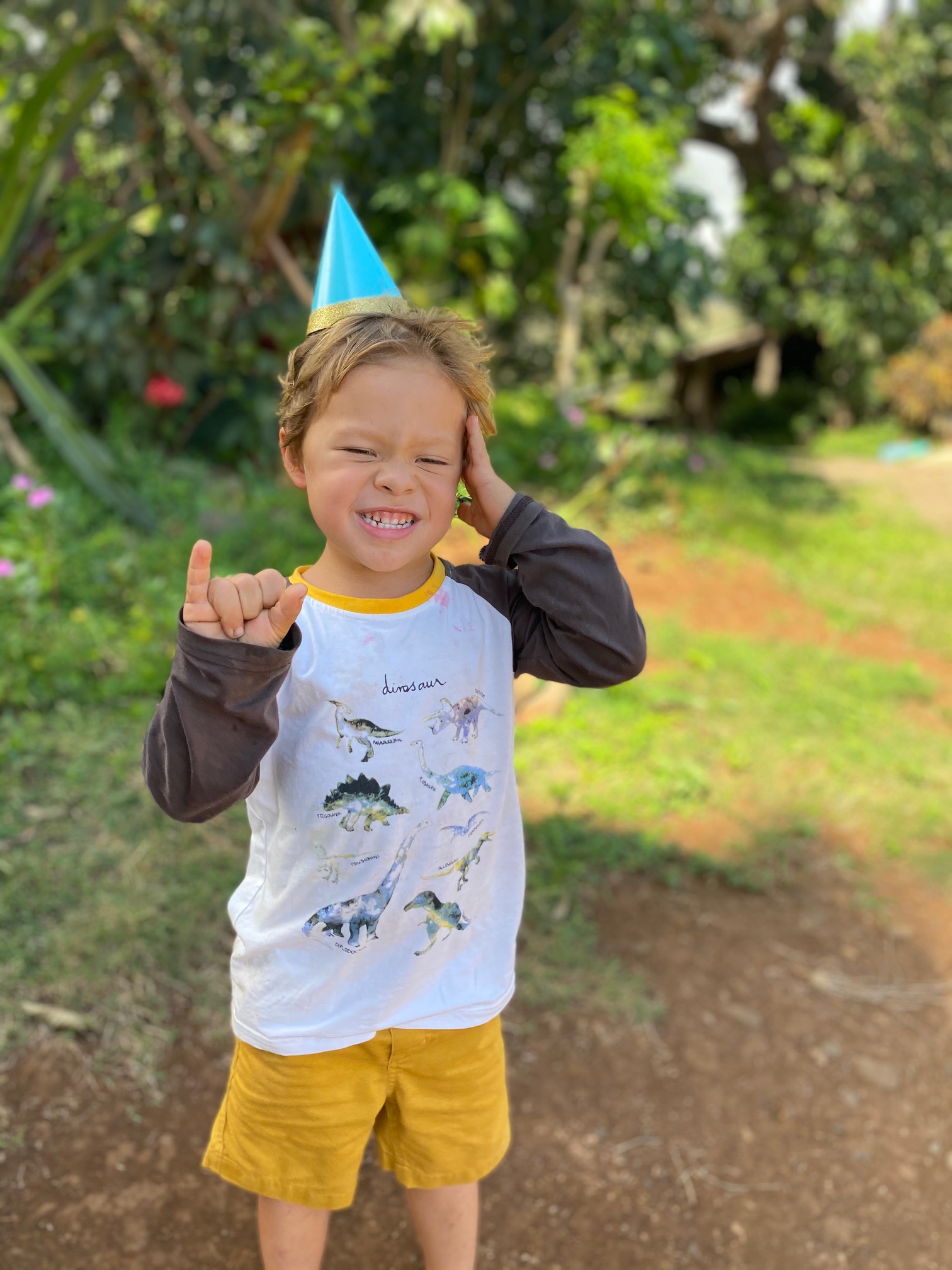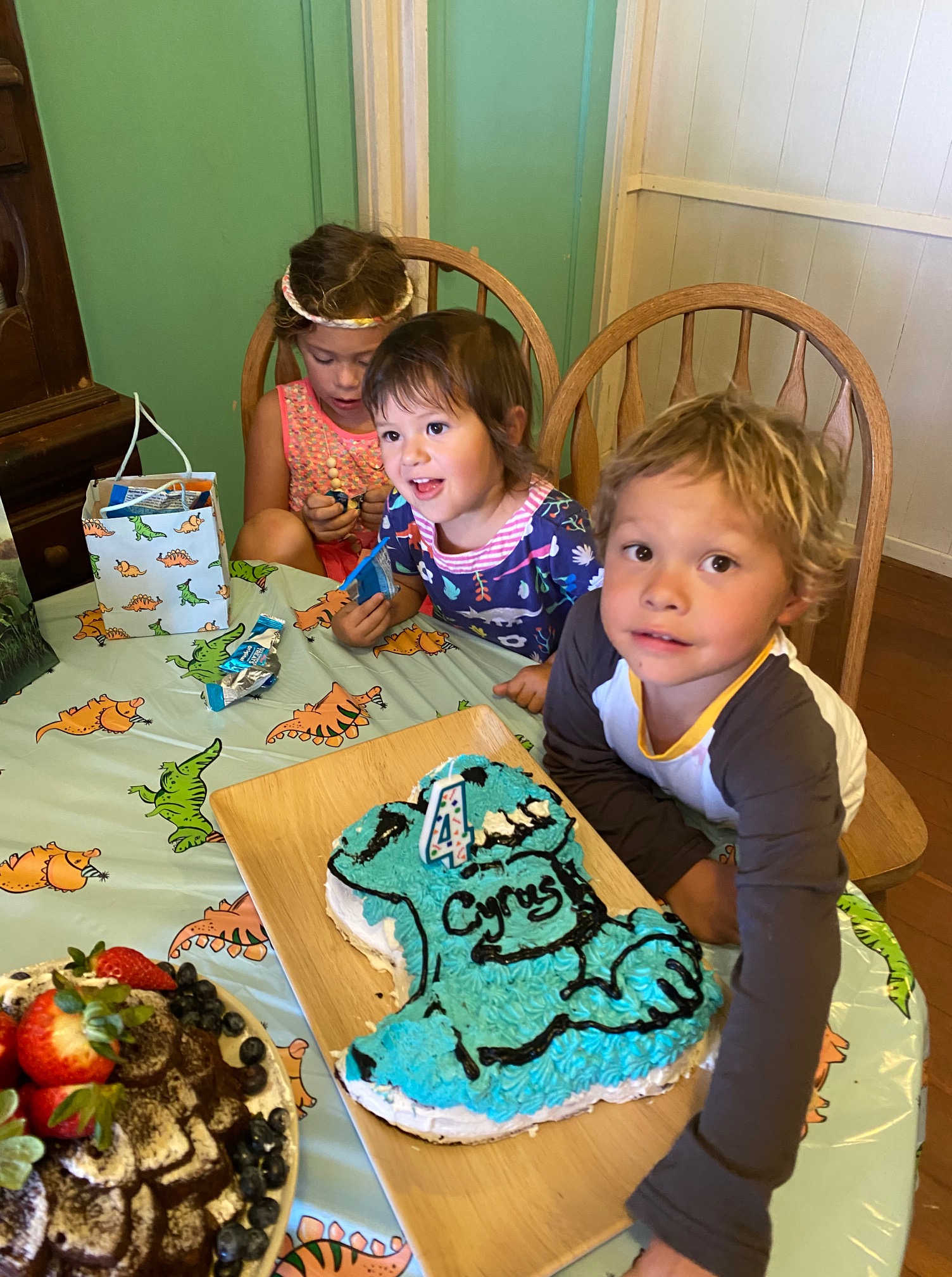 We celebrated Cyrus at my family’s farm with a rich, moist homemade chocolate cake that was allergy-friendly and shaped like a giant, smiling T-rex. Our whole menu centered around foods that Cyrus could enjoy. An allergy-friendly Hawaiian feast! I made two types of fried chicken, Hawaiian-style mochiko chicken (battered in rice flour) and buttermilk ranch chicken, two cakes – one chocolate on chocolate and the other apple-banana with chocolate, fresh broccoli-cranberry salad and kale salad, potato salad, and cut up chunks of fresh sunrise papaya and Maui gold pineapple. Really, if you wake up at 4 a.m. and start prepping and cooking for a lunchtime party, the sky’s the limit with what you can make! 😉