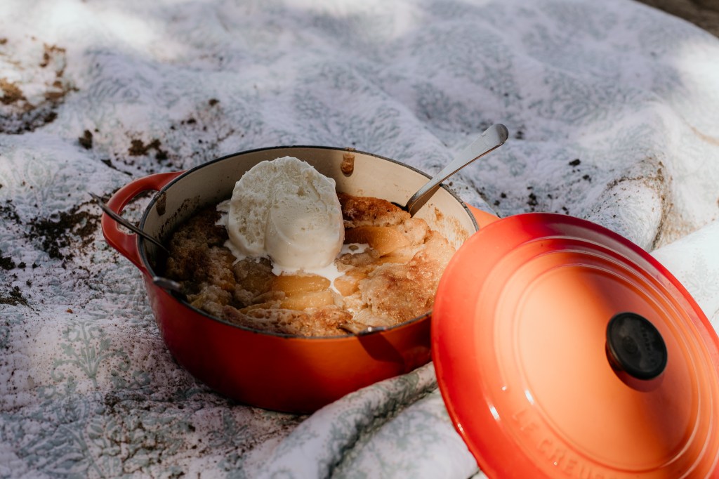 The other day, I thought to myself, “Why not pack along warm breakfast?” So, I baked up a little peach oatmeal cobbler in my favorite (and only) workhorse Le Creuset dutch oven + we brought it to the beach for a morning treat. Along with ice cream, because of course…